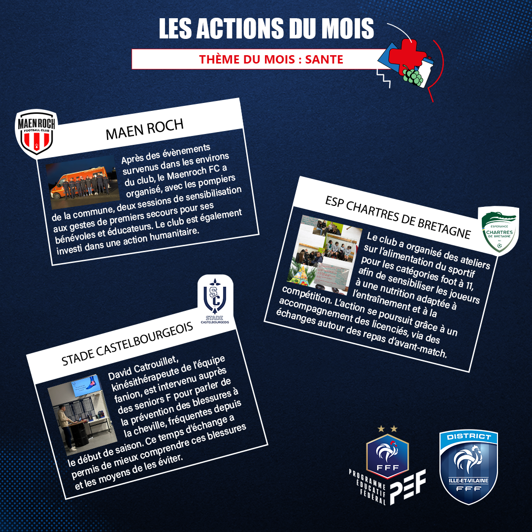 Retrouvez l’ensemble des actions éducatives et citoyennes réalisées par les clubs bretilliens dans le cadre du Programme Educatif Fédéral (PEF) en janvier 2026 sur le thème du mois : Santé, avec 45 clubs impliqués pour un total de 93 actions.