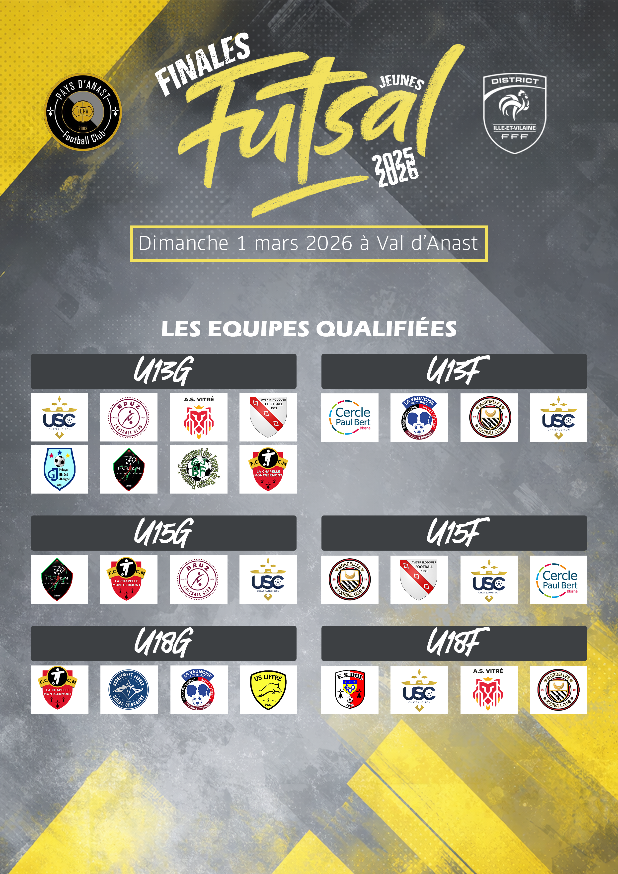 Les Finales départementales futsal jeunes pour cette saison 2025/2026 auront lieu ce dimanche 1er mars dans les salles Calypso et Alcyone (16 rue du Querpon) à Val d’Anast.